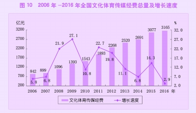 据财政部统计,2016年全国财政支出中,文化体育传媒经费3165亿元,比上年增长2.9%,占财政支出的1.68%,比重比上年下降0.07个百分点。