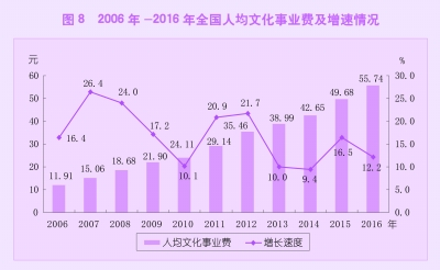 全年全国文化事业费770.69亿元,比上年增加87.72亿元,增长12.8%;全国人均文化事业费55.74元,比上年增加6.06元,增长12.2%。