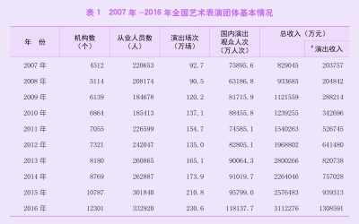 2016年,全国艺术院团继续深入开展“深入生活、扎根人民”主题实践活动,加强创作规划引导,促进精品创作。全年原创首演剧目1423个。扎实推进《关于支持戏曲传承发展的若干政策》,实施戏曲振兴工程,开展“名家传戏——当代戏曲名家收徒传艺”工程,扶持了100名京剧、地方戏表演艺术家向200名青年演员传授经典折子戏。成功举办第十一届中国艺术节,全面落实“精品、惠民、节俭、可持续”的办节原则,实现了“艺术的盛会、人民的节日”的办节宗旨,共汇聚67台参评参演剧目和1000余件美术作品,观众达40万人次。国家艺术基金2016年共有966个项目获得立项资助,较2015年增长了32.7%,资助资金总额7.3亿元。