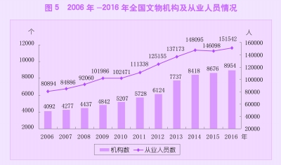 2016年,国家文物局印发《关于促进文物合理利用的若干意见》,推动相关部门联合印发《“互联网+中华文明”三年行动计划》,多措并举让文物活起来。编制《国家文物事业发展“十三五”规划》和大遗址保护等专项规划。出台《关于加强革命文物工作的通知》,开展革命旧址维修保护三年行动计划,启动“长征——红色记忆”工程,实施馆藏革命文物保护修复计划,开展红军长征遗迹保护展示和环境整治工程。“平安故宫工程”故宫北院区建设项目、地下文物库房改造、世界文化遗产监测等7个项目稳步推进。启动“考古中国”等重大考古专项、川渝石窟保护工程和万里茶道文物资源保护研究工程。广西左江花山岩画文化景观成功申遗,中国世界遗产总数达到50项。文物援外工作和境外合作考古项目稳步推进。启动文物法人违法案件专项整治三年行动,严肃查处了一批法人违法案件。发布《文物拍卖管理办法》《文物拍卖标的审核办法》,规范文物拍卖经营行为。完成第一次全国可移动文物普查工作,共普查全国可移动文物10815万件/套。年末全国共有文物机构8954个,比上年末增加278个。其中,文物保护管理机构3318个,占37.1%,博物馆4109个,占45.9%。年末全国文物机构从业人员15.15万人,比上年末增加0.54万人。其中高级职称8473人,占5.6%,中级职称18943人,占12.5%。