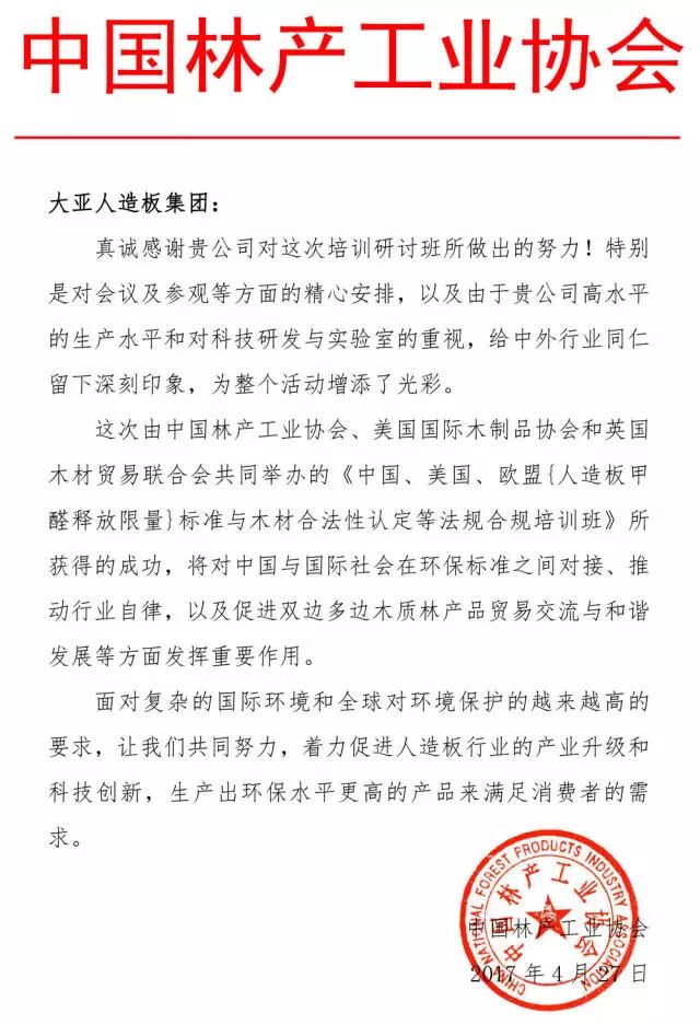 2017年4月26日-27日,由中国林产工业协会、美国国际木制品协会(IWPA)、英国木材贸易联合会(TTF)联合主办,大亚人造板集团有限公司、中国林产工业协会标准化技术委员会承办的中国、美国、欧盟《人造板甲醛释放限量》标准与木材合法性法规研修班在江苏省丹阳市隆重召开,来自大亚人造板集团有限公司、南京林业大学、中国质量认证中心、中国合格评定国家认可中心、中国建材认证、广东产品质量监督检验研究院、黑龙江省木材科学研究所、通标标准技术服务有限公司、道和律师事务所等近百家的企事业单位,200余名代表参会。