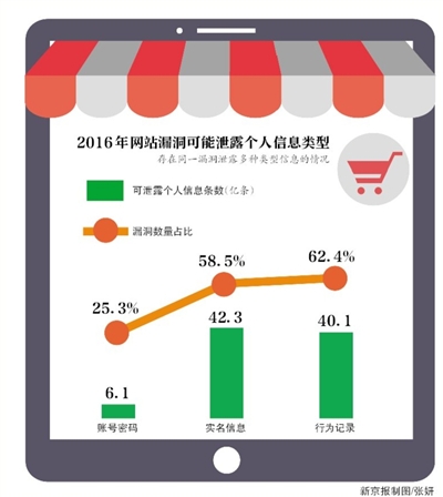 根据今年3月补天平台发布的《2016年网站泄露个人信息形势分析报告》,2016年有超过一半的网站漏洞会导致泄露实名信息和行为信息,分别占58.5%和62.4%(某些漏洞可能同时泄露2类信息),可能泄露的数量多达42.3亿条和40.1亿条。