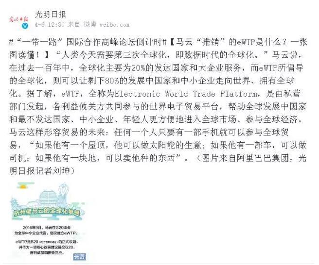 在杭州阿里巴巴集团西溪园区,记者了解到,不久前阿里巴巴与马来西亚数字经济发展机构(MDEC)达成合作,双方将在马来西亚打造中国以外的第一个全球电子商务平台(eWTP)试验区。“这是我们对国家‘一带一路’倡议的响应,也是用现代互联网技术赋予‘一带一路’新的内涵。”阿里巴巴集团总监、eWTP项目总负责人宋君涛说,试验区将被打造成物流、支付、通关、数据一体化的“数字中枢”,为马来西亚中小企业提供全球贸易的互联网基础设施,将成为当地发展数字经济的重要支撑。