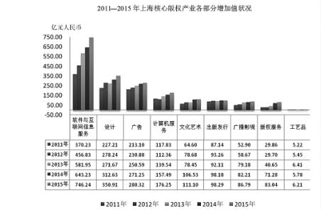 据《报告》,从2011年到2015年,上海核心版权产业各部分的增加值总体呈现良好的上升态势,行业增加值总量新增671.86亿元人民币。增加值排列前三的行业分别是软件与互联网信息服务业、设计业和广告业。其中,软件与互联网信息服务业5年来一直位列上海核心版权产业各行业的首位,成为核心版权产业发展的中坚力量;设计业的增加值始终处于较高增加值水平,已经突破300亿元大关;广告业的增加值近3年的增速有所放缓。