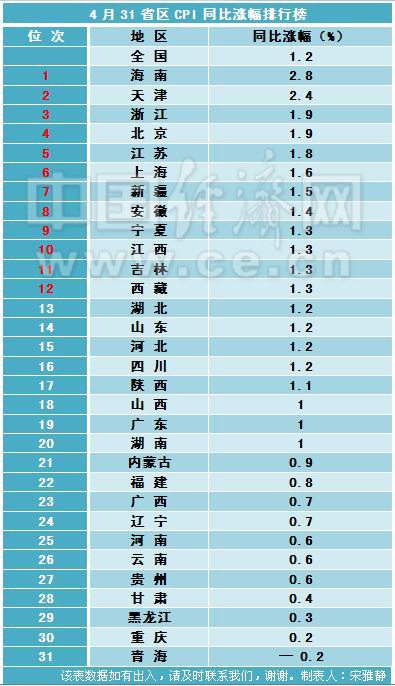在中国经济网制作的31省区4月CPI涨幅排行榜中可以看到,海南4月份CPI同比上涨2.8%位居全国第一,天津CPI同比上涨2.4%排第二,浙江和北京以1.9%的涨幅并列第三。全国仅第一位的海南和第二位的天津CPI处于“2时代”,处于“1时代”省份最多。