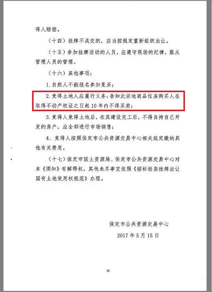 5月20日,据河北日报旗下燕赵都市报官方微信报道,保定一幅最新挂牌的住宅土地在出让条件中规定,购房人在取得不动产权证之日起10年内不得买卖。这也是目前全国范围内对住宅限售时间最长的规定。