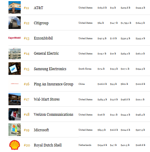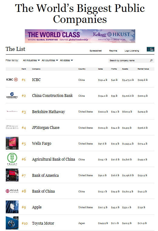 以下是福布斯《2017年全球上市公司2000强》前20名名单: