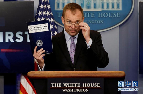 5月23日,在美国首都华盛顿,白宫行政管理和预算局局长米克·马尔瓦尼展示特朗普政府2018财年(今年10月1日至明年9月30日)联邦政府预算报告。新华社/路透
