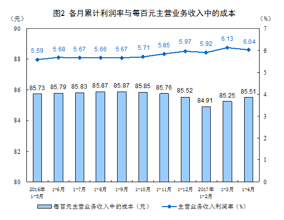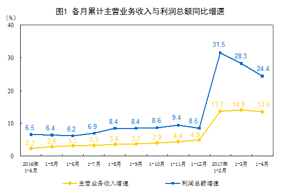 1-4月份,规模以上工业企业实现主营业务收入37.7万亿元,同比增长13.5%;发生主营业务成本32.2万亿元,增长13.4%;主营业务收入利润率为6.04%,同比提高0.53个百分点。