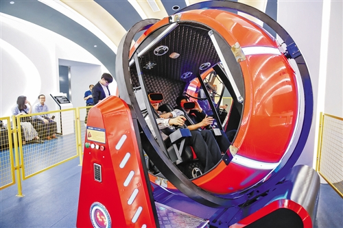 5月16日,在浙江余姚市举办的第四届中国机器人峰会上,观众在体验“720度VR时光机”浸入式游戏。当前,我国版权产业已初具规模,其中的网络游戏产业逐步开始抢占全球市场。 许丛军摄(新华社发)