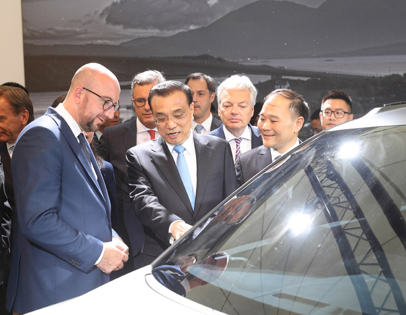 当地时间6月2日晚,国务院总理李克强在布鲁塞尔与比利时首相米歇尔(左)共同参观吉利沃尔沃汽车创新成果展。