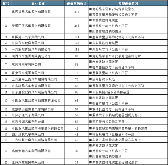 据公安交通部门统计,2016年全国各地在办理新出厂机动车登记时共发现376家汽车企业生产的3337辆汽车产品“涉嫌违规”。经核实确认,共有2577辆汽车产品存在违规行为,其中货车类产品违规生产问题比较突出,主要包括未按规定安装防抱死制动装置、侧后防护装置、车辆产品标牌,未按规定粘贴车身反光标识,车辆识别代号打刻不符合国家标准、随意凿改,外廓尺寸和整备质量与《道路机动车辆生产企业及产品公告》或《整车出厂合格证》参数不一致等。
