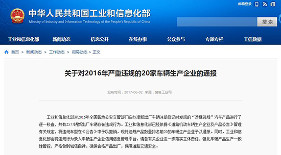 6月2日讯 今日,工业和信息化部(以下简称“工信部”)对2016年严重违规的20家车辆生产企业进行了通报。其中,北汽福田、江淮、一汽和东风股份等汽车生产企业赫然在列。