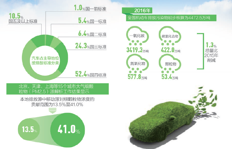 ●年报显示,2016年全国机动车排放污染物初步核算为4472.5万吨,比2015年削减1.3%