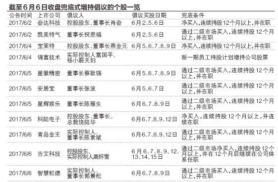 自上周五奋达科技和凯美特气午间发布公告,高喊员工买入自家股并承诺兜底后,A股市场又刮起了第四次股东兜底增持潮。截至6月6日收盘,记者发现,兜底式增持的公司已多达10家。这10家中最大手笔的老板就是吉艾科技,其倡议员工买股的时间最充足,为6月6日~6月15日。宝莱特、星徽精密、科陆电子、青岛金王四家公司则是5个交易日,奋达科技等3家公司则最少只有3个交易日。另外,从兜底条件看,10家公司中有9家公司给出的兜底条件为:通过二级市场买入(或净买入),连续持股12个月以上,并在职。只有锦富技术不同,其兜底条件为新一期员工持股计划增持公司股票。