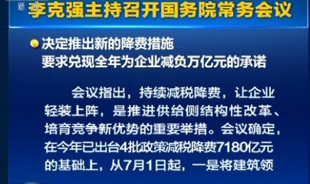 会议指出,持续推出减税降费措施,让企业轻装上阵,是推进供给侧结构性改革、培育我国竞争新优势的重要举措。会议确定,在今年已出台4批政策减税降费7180亿元的基础上,从今年7月1日起,一是将建筑领域工程质量保证金预留比例上限由5%降至3%。二是清理能源领域政府非税收入电价附加,取消其中的工业企业结构调整专项资金,将国家重大水利工程建设基金和大中型水库移民后期扶持基金征收标准降低25%。三是降低电信网码号资源占用费、农药实验费、公安部门相关证照费等6项行政事业性收费标准。四是暂免征银行业和保险业监管费。采取上述新措施,预计每年可再减轻企业负担2830亿元,合计全年为企业减负超过1万亿元,其中降费占60%以上。会议要求,要加强督促检查,尽快把减税降费政策不打折扣地落到实处,让广大企业真正受益。下一步,各级政府要建立行政事业性收费和政府性基金、政府定价的涉企经营服务性收费、财政补助事业单位收费目录清单制度。国务院主管部门要在7月1日前上网公布中央和地方政府性基金及行政事业性收费目录清单,实现全国“一张网”动态化管理,从源头上防范乱收费,决不让已“瘦身”的制度性交易成本反弹。