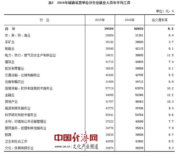 北京6月9日讯 近日,国家统计局发布了2016年城镇私营单位及非私营单位就业人员分行业的年平均工资。其中,在城镇私营单位工作的文化、体育和娱乐业就业人年均工资为38228元,比2015年的34974元增长了3254元,名义增长率为9.3%。和城镇私营单位就业人员年平均工资相比,文体娱业平均工资要少4605元,位列18个行业中的第15位。