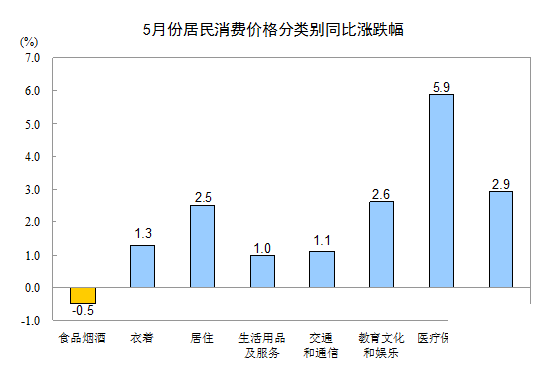 5月份,其他七大类价格同比均有所上涨。其中,医疗保健价格上涨5.9%,其他用品和服务价格上涨2.9%,教育文化和娱乐价格上涨2.6%,居住价格上涨2.5%,衣着、交通和通信、生活用品及服务价格分别上涨1.3%、1.1%和1.0%。