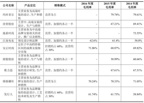 2014年-2016年日播时尚毛利率分别为58.84%、61.73%和61.74%。国内服装公司:玛丝菲尔、欣贺股份、江南布衣、安正时尚、朗姿股份、歌力思、维格娜丝2015年毛利率分别达到了79.74%、67.21%、61.40%、68.87%、58.99%、67.61%、70.33%,其中,安正时尚、维格娜丝2016年毛利率达71.06%、70.24%。