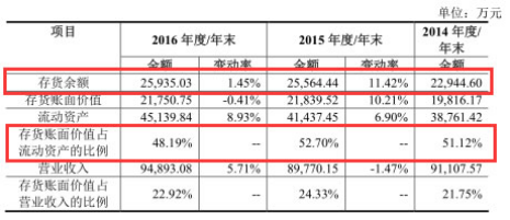 据最新招股书显示, 2012 年度、2013 年度、2014 年度、2015 年度、2016 年度公司实现营业收入分别为77,802.03万元、92,902.92万元、91,107.57万元、89,770.15万元、94,893.08万元。净利润分别为12,963.55万元、11,272.84万元、8,437.03万元、7,526.41万元、7,735.02万元。应收账款净额分别为6,409.45万元、5,065.71万元、4,981.52万元、7,328.86 万元、6,741.45 万元。应收账款周转率分别为13.63、16.19、18.14、14.58、13.49。存货账面价值分别为17,769.31万元、20,501.52万元、19,816.17万元、21,839.52 万元、21,750.75 万元。存货周转率分别为2.05、2.00、1.86、1.65、1.67。2014年-2016年末,公司存货账面余额分别为2.29亿元、2.56亿元和2.59亿元,占流动资产的比例分别为51.12%、52.7%、48.19%。其中库存商品余额分别为1.69亿元、1.844亿元和1.838亿元,占存货余额的比例均超过了70%。
