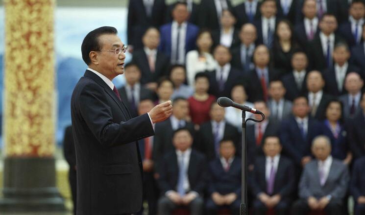 6月12日上午,李克强在人民大会堂金色大厅会见出席第二届世界华侨华人工商大会全体代表并发表讲话。