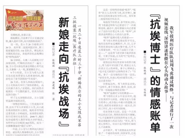 “中国军队援非抗击埃博拉系列报道”内容翔实、数据权威、体裁多样,既有发布宏观信息的消息,也有笔法生动细腻的特写,很多稿件文字精短,并且均是独家新闻。例如,《新娘走向“抗埃战场”》《三位“抗埃辣妈”的心语》《“抗埃博士”的情感账单》等稿件,通过大量鲜活感人的细节,从不同角度展现了中国军医精湛的医疗技术和过硬的战斗作风,展示了中国军队和平之师、文明之师的良好形象,产生了良好的国际传播效果。