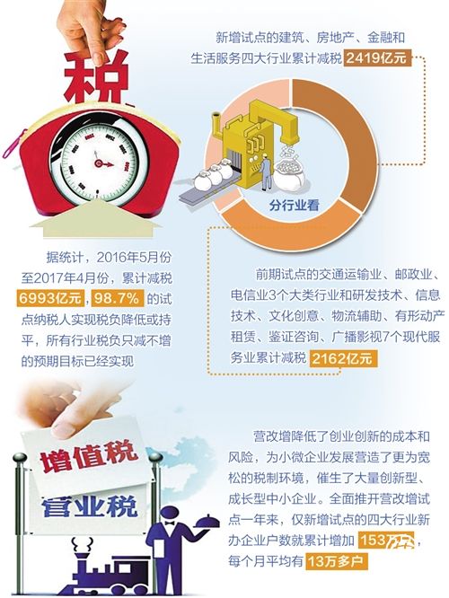 据统计,2016年5月份至2017年4月份,也就是全面推开营改增试点一年来,累计减税6993亿元,98.7%的试点纳税人实现税负降低或持平,所有行业税负只减不增的预期目标已经实现。分行业看,新增试点的建筑、房地产、金融和生活服务四大行业累计减税2419亿元,前期试点的“3+7”行业(交通运输业、邮政业、电信业3个大类行业和研发技术、信息技术、文化创意、物流辅助、有形动产租赁、鉴证咨询、广播影视7个现代服务业)累计减税2162亿元,原增值税行业,主要是制造业累计减税2412亿元。