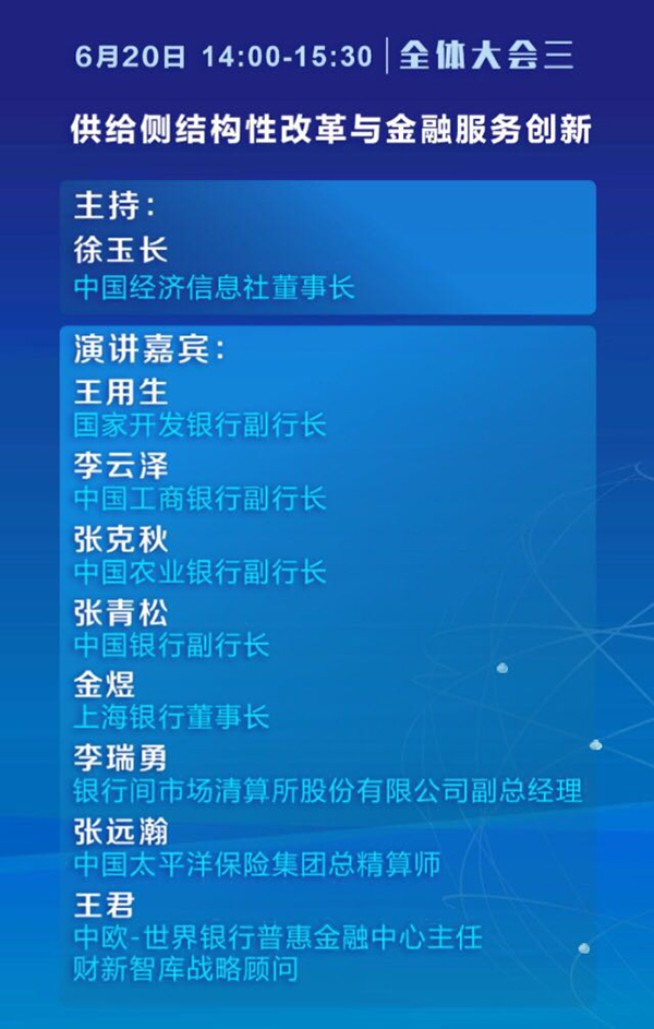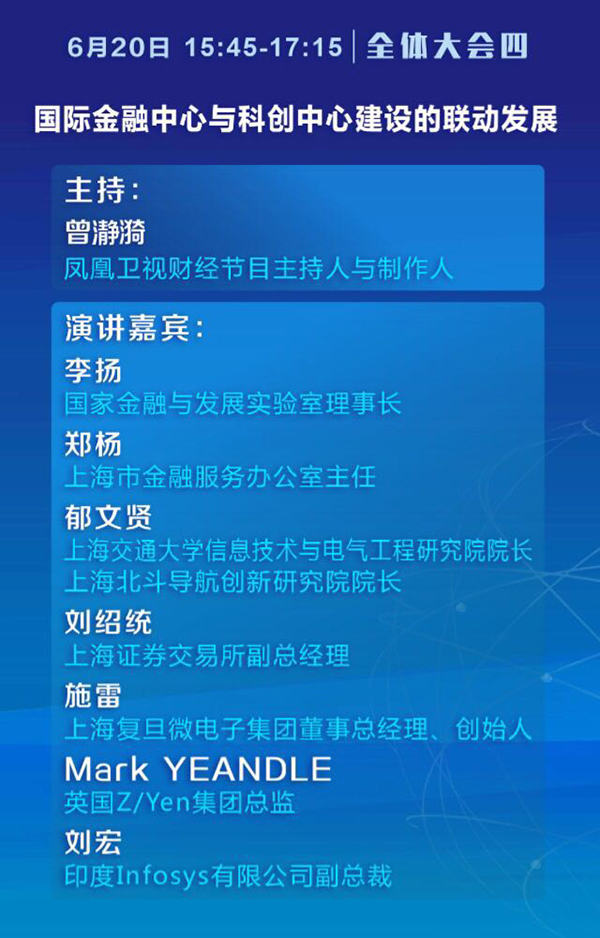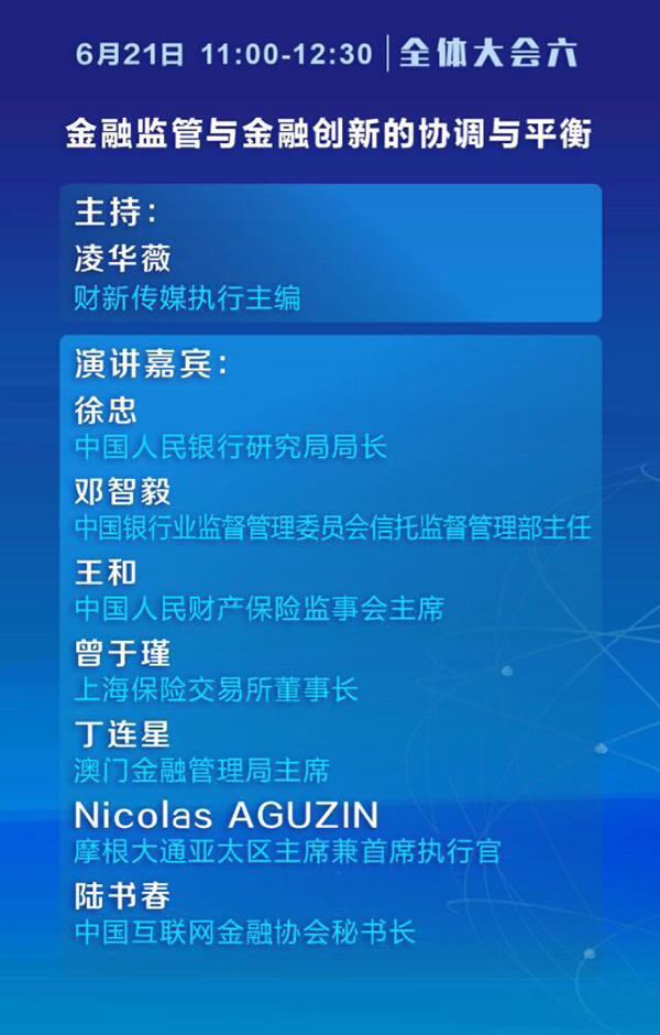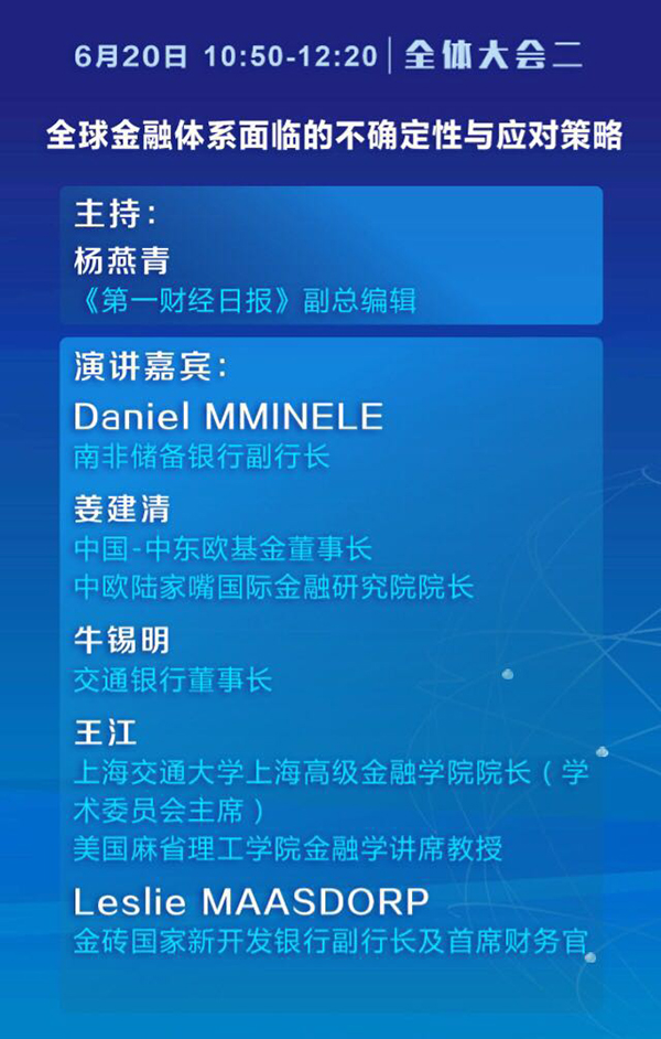 其中全体大会一主题为“全球视野下的金融改革与稳健发展”,中国人民银行行长周小川、上海市市长应勇、中国银监会副主席王兆星、中国证监会副主席姜洋、中国保监会副主席黄洪将分别做主题演讲。