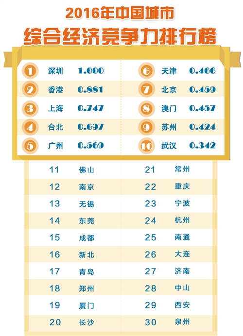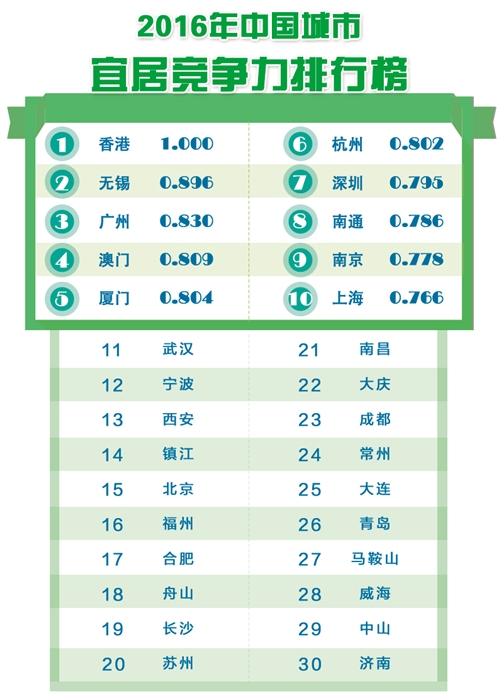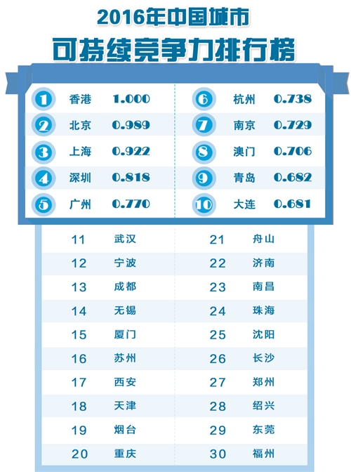 具有“东方之珠”美誉的香港在2016年可持续竞争力中排名全国第一,历史上,香港文化是东西方两种文化的互相碰撞、渗透、交融之地,1997年回归以后,香港依旧保持着经济自由、法律制度完备的世界领先位置,从制度上保障了香港的自由开放、融合中西、商业都市型的多元混合体系。香港知识城市竞争力排名第四,和谐城市排名第十七位,生态城市和全域城市排名第二,文化城市排名第八,信息城市排名第一。从具体指标来看,香港全部指标均比较靠前,但相比内地城市而言香港的万人刑事案件逮捕人数偏高。未来香港的发展在现有基础之上需在改善社会和谐、相融相通方面做出努力。(倪鹏飞 周晓波 李博 王雨飞 沈 立)