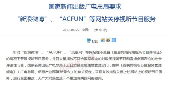北京6月23日讯 国家新闻出版广电总局网站22日消息,国家新闻出版广电总局(以下简称“总局”)于近日发函责成属地管理部门,关停“新浪微博”、“ACFUN”、“凤凰网”的视听节目服务,进行全面整改。