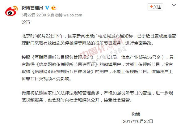 对此,新浪微博方面在22日晚间发布公告称,按照《互联网视听节目服务管理规定》,只有取得《信息网络传播视听节目许可证》的微博用户,才能上传视听节目,没有取得《信息网络传播视听节目许可证》的用户,不能上传视听节目。微博用户上传非节目类视频不受影响。