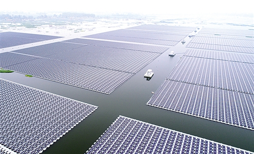 △安徽省淮南市潘集区采煤塌陷区水域上,总装机容量为40兆瓦的水上漂浮式光伏发电站开始陆续并网发电。 新华社记者 郭 晨摄