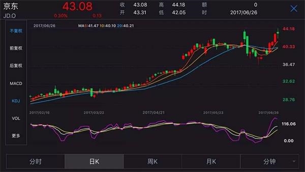 在刚刚过去的“618”购物节, 京东 不但业绩表现亮眼,全平台交易额达到1199亿元,股价同样表现亮眼,北京时间6月19日当日大涨4.11%。而截至北京时间6月27日收盘,京东股价达到43.08美元/股,不但股价创出历史新高,市值也达到611亿美元,与近期股价表现相对低迷的 百度 差距只剩8亿美元,“京东即将把百度挤出BAT”“JAT将取代BAT”也在近日引发了市场的热烈讨论。