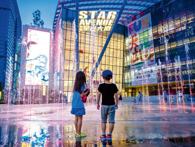 小朋友在杭州市滨江区一家商场门口观赏音乐喷泉 张铖摄