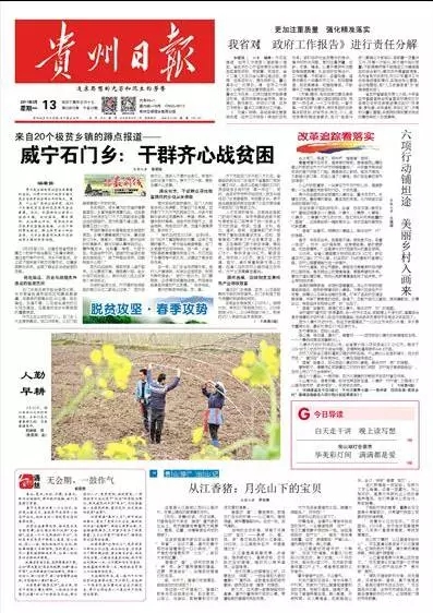 2月13日开始,《贵州日报》开设重磅栏目“脱贫攻坚最前线——来自20个极贫乡镇的蹲点报道”,以每周一篇的速度,先后推出了《威宁石门乡:干群齐心战贫困》《晴隆三宝彝族乡:因地制宜找准路子 干群一心攻坚脱贫》《镇宁简嘎乡:众志成城摘穷帽》等一组来自贵州极贫乡镇的蹲点报道,探问贫困原因,呈现脱贫路径。该组报道充分展现了贵州各地领导把脱贫责任扛在肩上,带头开展蹲点调研,深入基层、深入农村、深入一线,挂帅出征、运筹帷幄、冲锋陷阵的精神风貌,以及各地各部门以“钉钉子”的精神推进脱贫攻坚、以“转盘子”的方法抓好脱贫工作的生动场景;同时展现了广大党员干部和群众心往一处想、劲往一处使、拿出硬办法、彻底“拔穷根”的决心。