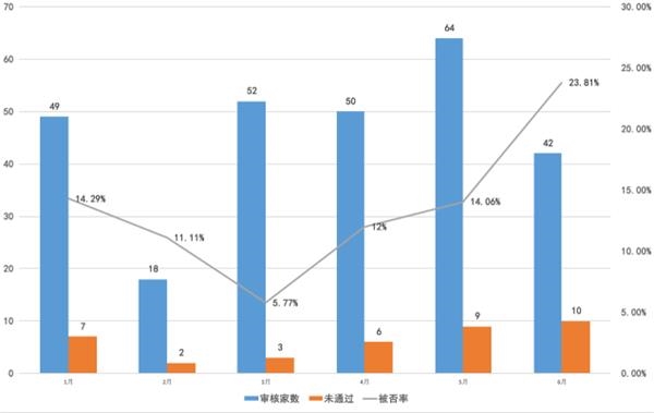 截至6月30日,今年以来证监会已经审核了275家公司的首发申请,224家获通过,37家被否,其他14家则为暂缓表决、取消审核等情形,被否率13.45%。其中,6月份共审核42家企业首发申请,否决10家,被否率为23.81%,远高于5月份的14.06%。