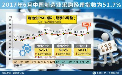 据英国《泰晤士报》网站7月1日报道,中国国家统计局数据显示,中国6月制造业采购经理人指数(PMI)为51.7,高于5月的51.2。