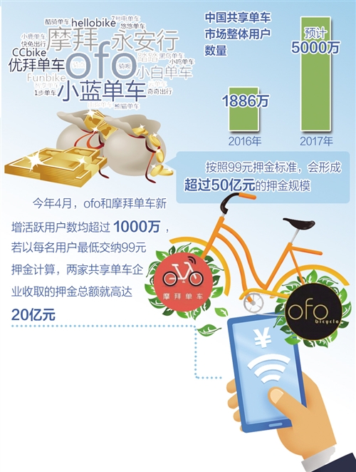根据第三方数据机构易观的报告,今年4月份,ofo和摩拜单车新增活跃用户数均超过1000万,若以每名用户最低交纳99元押金计算,两家共享单车企业收取的押金总额就高达20亿元。一边是持续增长的分享经济用户数,另一边是滚雪球般增加的押金,风险正在不断积累。