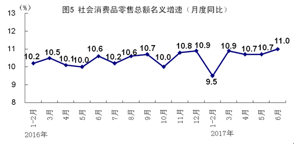 上半年,社会消费品零售总额 172369 亿元,同比增长 10.4% ,增速比一季度加快 0.4 个百分点,比上年同期加快 0.1 个百分点。其中,限额以上单位消费品零售额 76953 亿元,增长 8.7% 。按经营单位所在地分,城镇消费品零售额 147786 亿元,增长 10.1% ;乡村消费品零售额 24583 亿元,增长 12.3% 。按消费类型分,餐饮收入 18546 亿元,增长 11.2% ;商品零售 153822 亿元,增长 10.3% ,其中限额以上单位商品零售 72420 亿元,增长 8.8% 。消费升级类商品销售增长较快,文化办公用品增长 11.8% ,体育娱乐用品增长 17.1% ,家具增长 13.4% ,建筑及装潢材料增长 13.9% 。 6 月份,社会消费品零售总额同比增长 11.0% ,比上月加快 0.3 个百分点,环比增长 0.93% 。