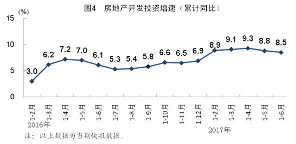 过剩产能有序化解,上半年全国工业产能利用率为 76.4% ,比上年同期提高 3.4 个百分点。房地产去库存效果继续显现, 6 月末商品房待售面积同比下降 9.6% ,降幅比 3 月末扩大 3.2 个百分点。企业杠杆率下降, 5 月末规模以上工业企业资产负债率为 56.1% ,同比下降 0.7 个百分点。企业成本继续降低, 1-5 月份规模以上工业企业每百元主营业务收入中的成本为 85.62 元,同比减少 0.04 元。短板领域得到加强,上半年生态保护和环境治理业、水利管理业、交通运输仓储和邮政业、教育投资同比分别增长 46.0% 、 17.5% 、 14.7% 和 17.8% ,均明显快于同期固定资产投资增速。