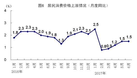 上半年,全国居民消费价格同比上涨 1.4% ,涨幅与一季度持平。其中,城市上涨 1.5% ,农村上涨 1.0% 。分类别看,食品烟酒价格同比下降 0.8% ,衣着上涨 1.3% ,居住上涨 2.4% ,生活用品及服务上涨 0.8% ,交通和通信上涨 1.5% ,教育文化和娱乐上涨 2.5% ,医疗保健上涨 5.4% ,其他用品和服务上涨 3.3% 。在食品烟酒价格中,粮食价格上涨 1.4% ,猪肉价格下降 6.1% ,鲜菜价格下降 14.7% 。 6 月份,全国居民消费价格同比上涨 1.5% ,涨幅与上月持平,环比下降 0.2% 。
