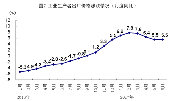 上半年,全国工业生产者出厂价格同比上涨 6.6% ,涨幅比一季度回落 0.8 个百分点。 6 月份,全国工业生产者出厂价格同比上涨 5.5% ,涨幅与上月持平,环比下降 0.2% 。上半年,全国工业生产者购进价格同比上涨 8.7% ; 6 月份同比上涨 7.3% ,环比下降 0.4% 。