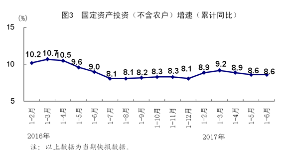 上半年,全国固定资产投资(不含农户) 280605 亿元,同比增长 8.6% ,增速比一季度回落 0.6 个百分点。其中,国有控股投资 102022 亿元,增长 12.0% ;民间投资 170239 亿元,增长 7.2% ,比 1-5 月份加快 0.4 个百分点,比上年同期加快 4.4 个百分点,占全部投资的比重为 60.7% 。分产业看,第一产业投资 8694 亿元,增长 16.5% ;第二产业投资 105807 亿元,增长 4.0% ,其中制造业投资 86809 亿元,增长 5.5% ,比 1-5 月份加快 0.4 个百分点,增速连续两个月回升,比上年同期加快 2.2 个百分点;第三产业投资 166104 亿元,增长 11.3% 。基础设施投资 59422 亿元,增长 21.1% ,比 1-5 月份加快 0.2 个百分点,比上年同期加快 0.2 个百分点。高技术产业投资快速增长,高技术制造业和高技术服务业投资同比分别增长 21.5% 和 22.3% ,分别快于全部投资 12.9 和 13.7 个百分点。固定资产投资到位资金 286275 亿元,同比增长 1.4% ,增速由负转正。新开工项目计划总投资 237258 亿元,同比下降 1.2% ,降幅比 1-5 月份收窄 4.4 个百分点。从环比看, 6 月份固定资产投资(不含农户)比上月增长 0.73% 。