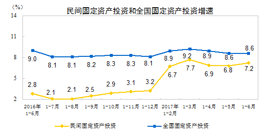 北京7月17日讯 据国家统计局网站消息,2017 年 1-6 月份,民间固定资产投资 170239 亿元,同比名义增长 7.2% ,增速比 1-5 月份提高 0.4 个百分点。民间固定资产投资占全国固定资产投资(不含农户)的比重为 60.7% ,比 1-5 月份回落 0.3 个百分点。
