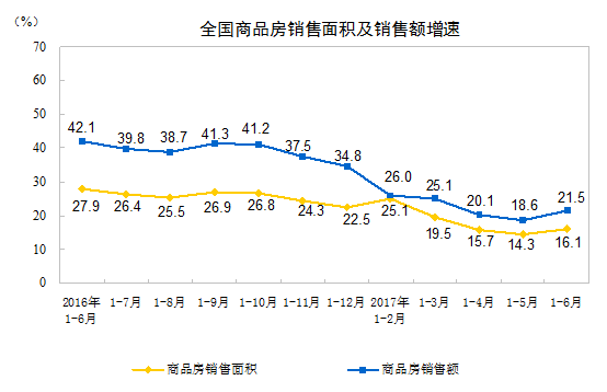 1-6 月份,商品房销售面积 74662 万平方米,同比增长 16.1% ,增速比 1-5 月份提高 1.8 个百分点。其中,住宅销售面积增长 13.5% ,办公楼销售面积增长 38.8% ,商业营业用房销售面积增长 32.5% 。商品房销售额 59152 亿元,增长 21.5% ,增速提高 2.9 个百分点。其中,住宅销售额增长 17.9% ,办公楼销售额增长 38.9% ,商业营业用房销售额增长 41.7% 。