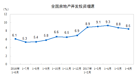 北京7月17日讯 据国家统计局网站消息,2017 年 1-6 月份,全国房地产开发投资 50610 亿元,同比名义增长 8.5% ,增速比 1-5 月份回落 0.3 个百分点。其中,住宅投资 34318 亿元,增长 10.2% ,增速提高 0.2 个百分点。住宅投资占房地产开发投资的比重为 67.8% 。