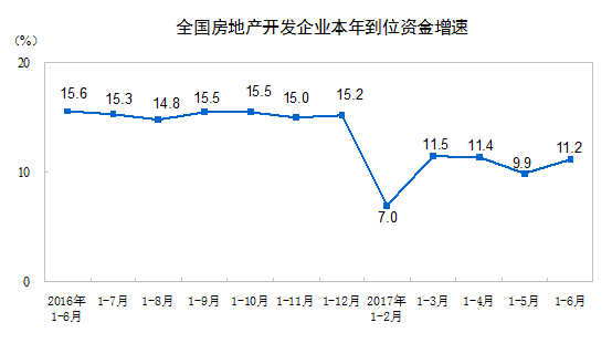 1-6 月份,房地产开发企业到位资金 75765 亿元,同比增长 11.2% ,增速比 1-5 月份提高 1.3 个百分点。其中,国内贷款 13352 亿元,增长 22.1% ;利用外资 104 亿元,增长 58.9% ;自筹资金 23273 亿元,下降 2.3% ;其他资金 39035 亿元,增长 17.2% 。在其他资金中,定金及预收款 23226 亿元,增长 22.7% ;个人按揭贷款 12000 亿元,增长 6.7% 。