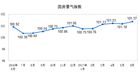 6 月份,房地产开发景气指数(简称“国房景气指数”)为 101.37 ,比 5 月份提高 0.19 点。