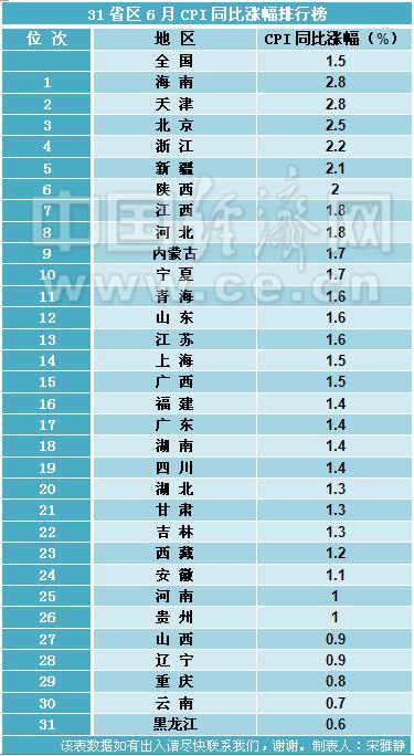 31省区6月CPI同比涨幅排行榜。制表人:宋雅静