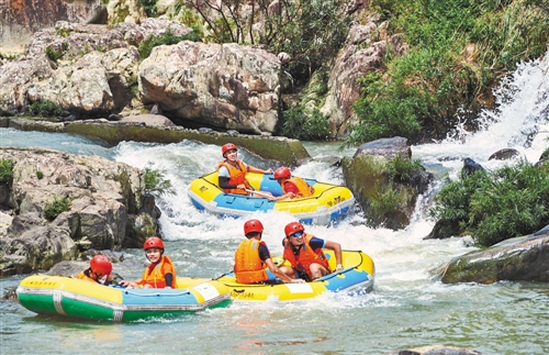 7月14日,游客在海南省五指山市红峡谷旅游景区漂流。 新华社记者 赵颖全 摄